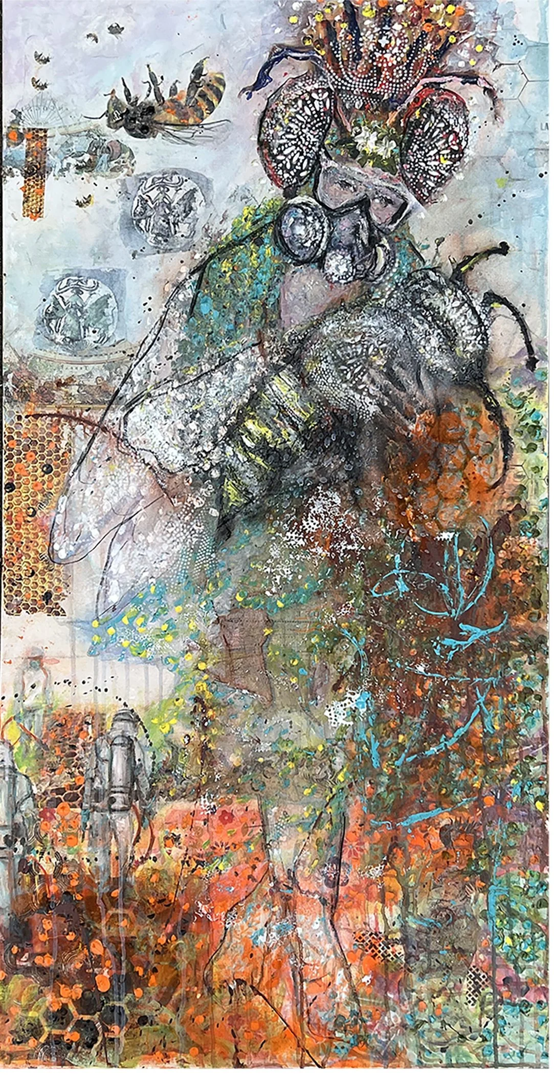 Inspired by the ancient bee goddess found engraved on onyx, Knossos Crete, c. 1500 BC — this assemblage attempts to raise awareness on the harmful effects herbicides have on nature and ourselves. Glyphosate (found in Roundup®) is widely used in agriculture and gardens. The effects it is having on bees especially the honeybee is critical and the link between glyphosate and non-Hodgkin's lymphoma, can no longer be ignored. “Roundup® Your Young” is a call to arms on behalf of the bee and ourselves. Monsanto, now owned by Bayer, mass produce these harmful chemicals and market them with little warning. Tons are sprayed on our agriculture annually and consumers in search for that lush green lawn have aisles of herbicides displayed prominently in every Lowes and Home depot across the country.